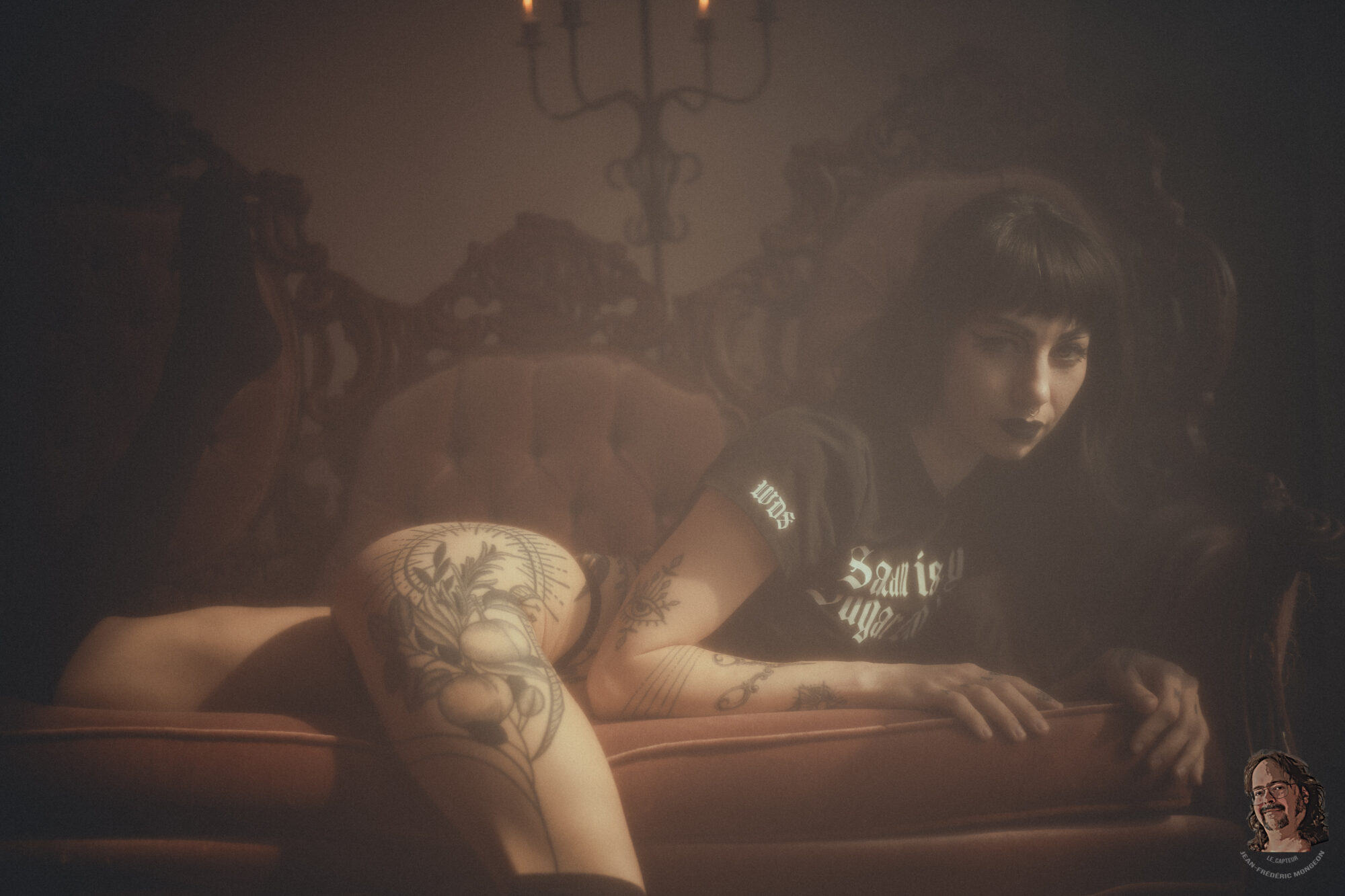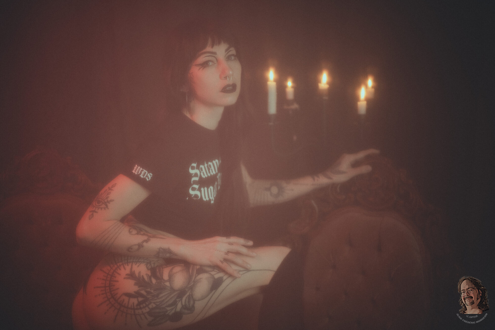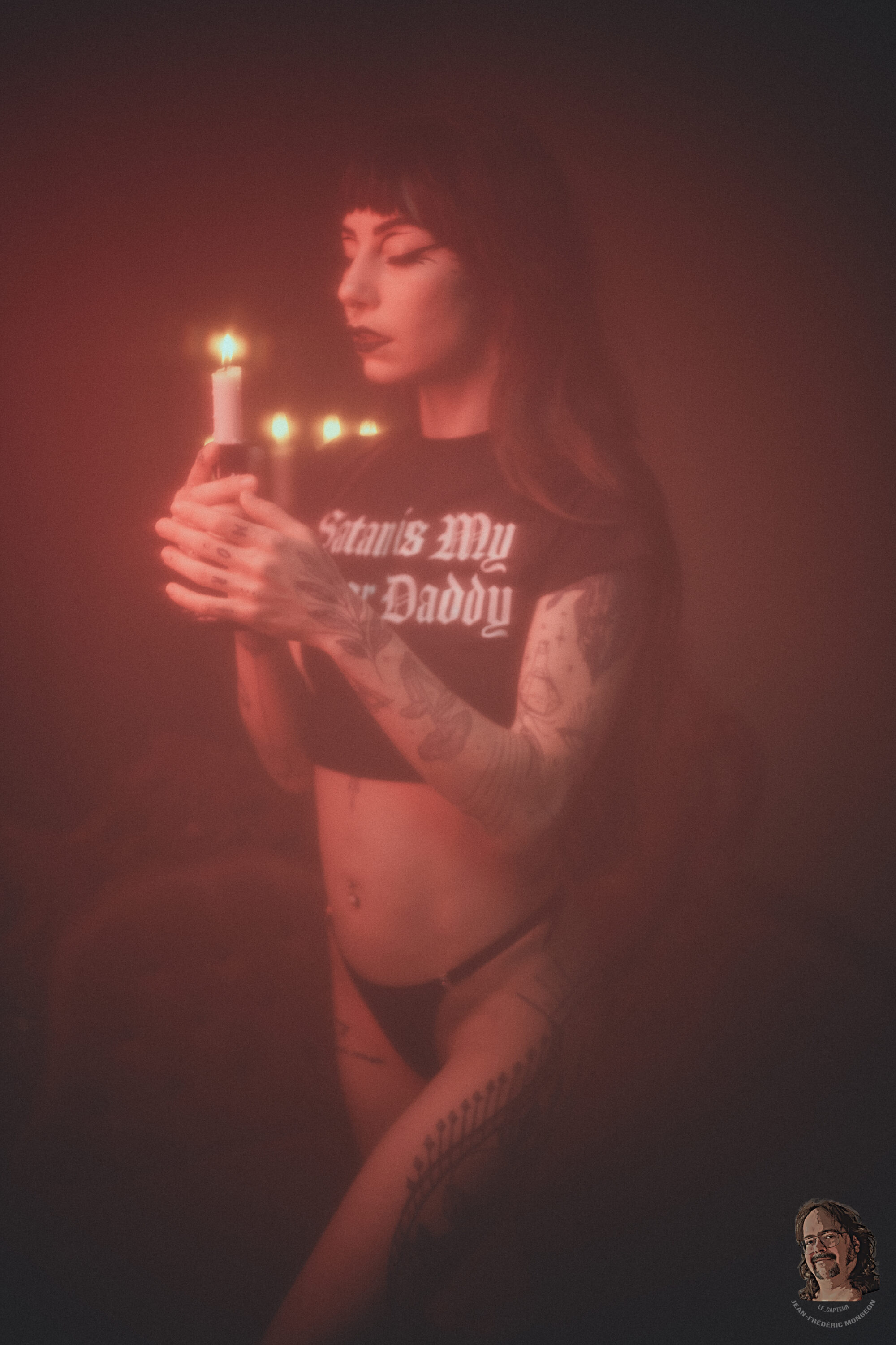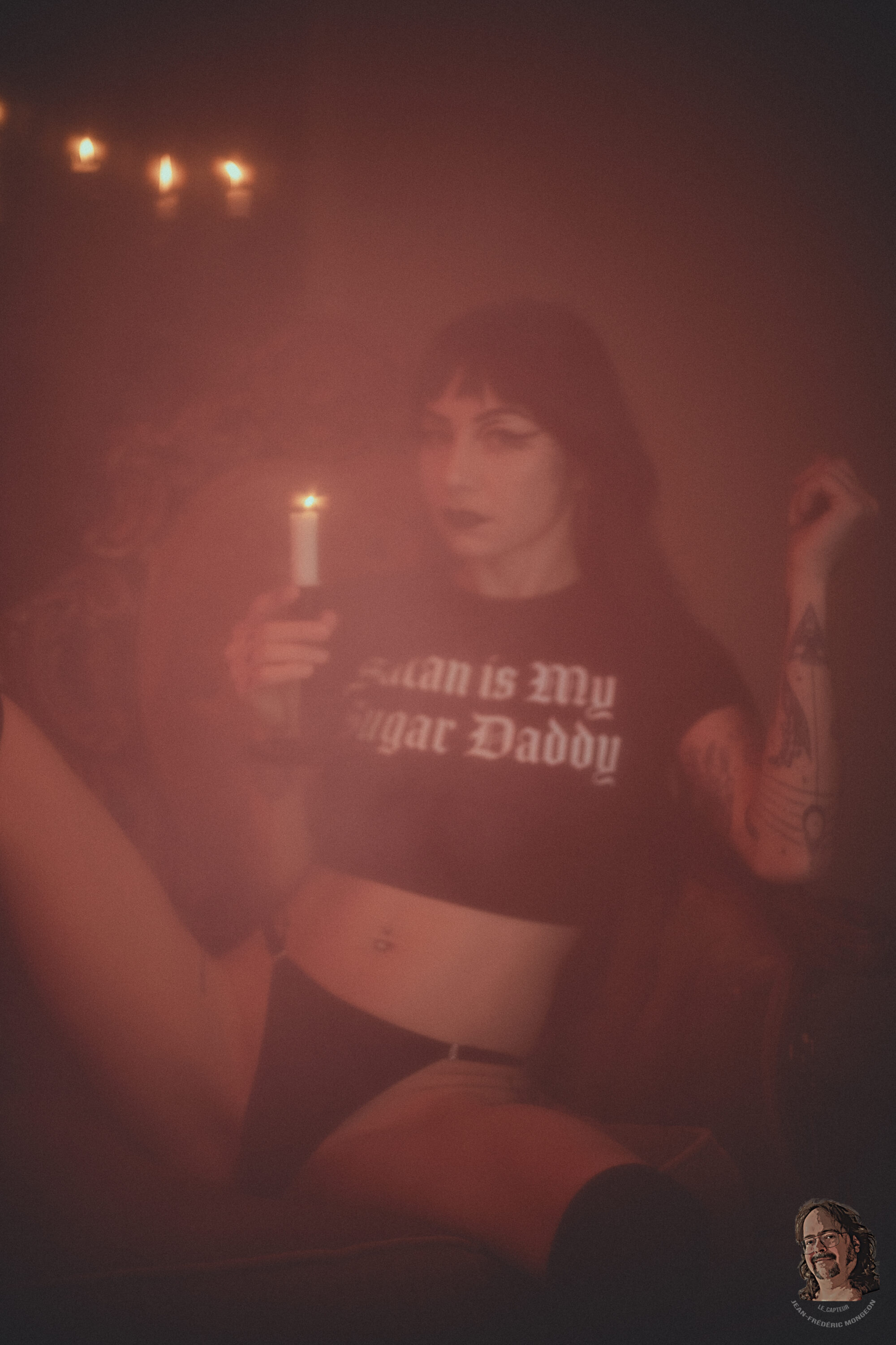 Entre velours, cierges et peau chaude, elle traverse la pièce comme une provocation douce. Une présence trouble, insolente et sensuelle, où le sacré se défait lentement dans la lumière rouge.