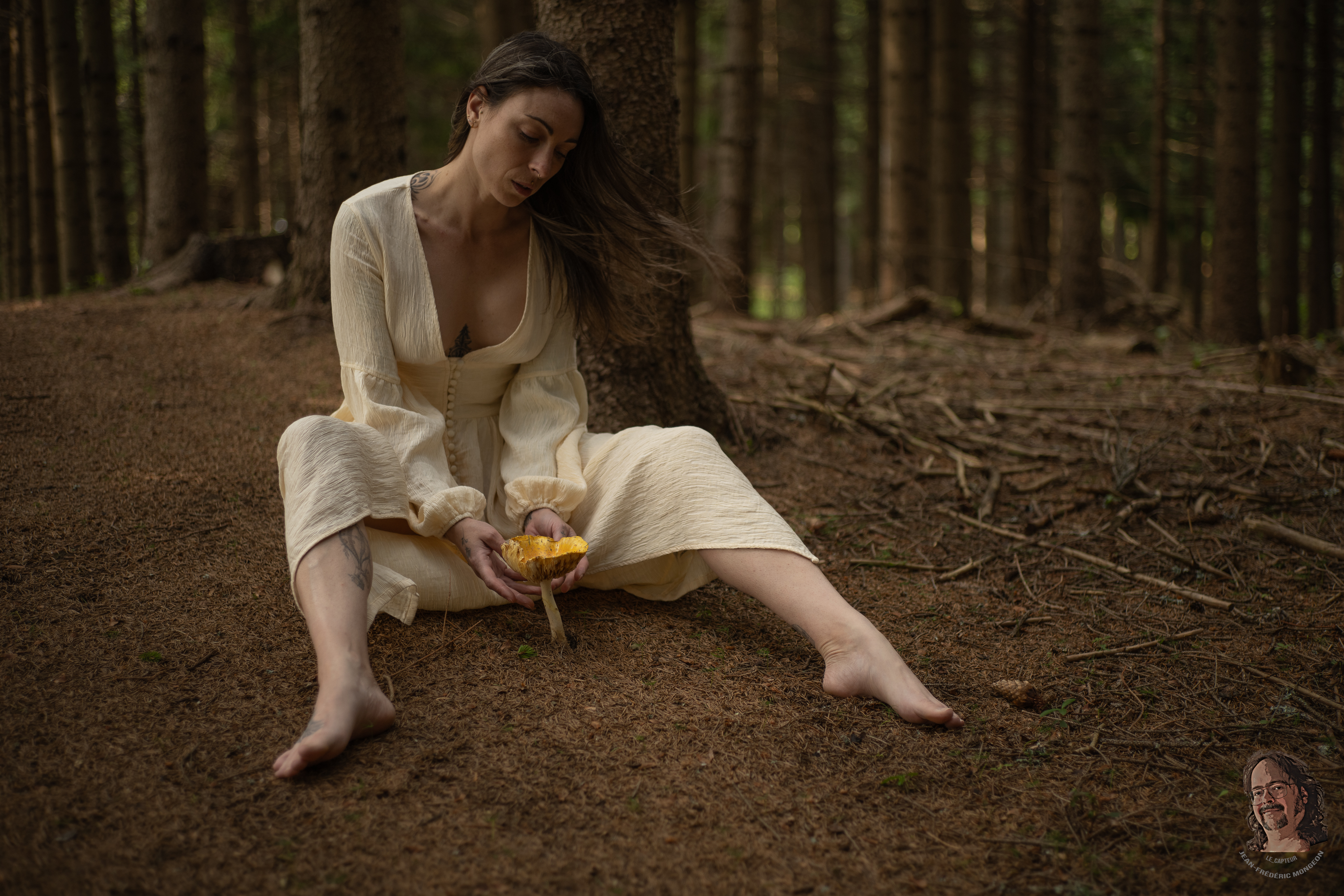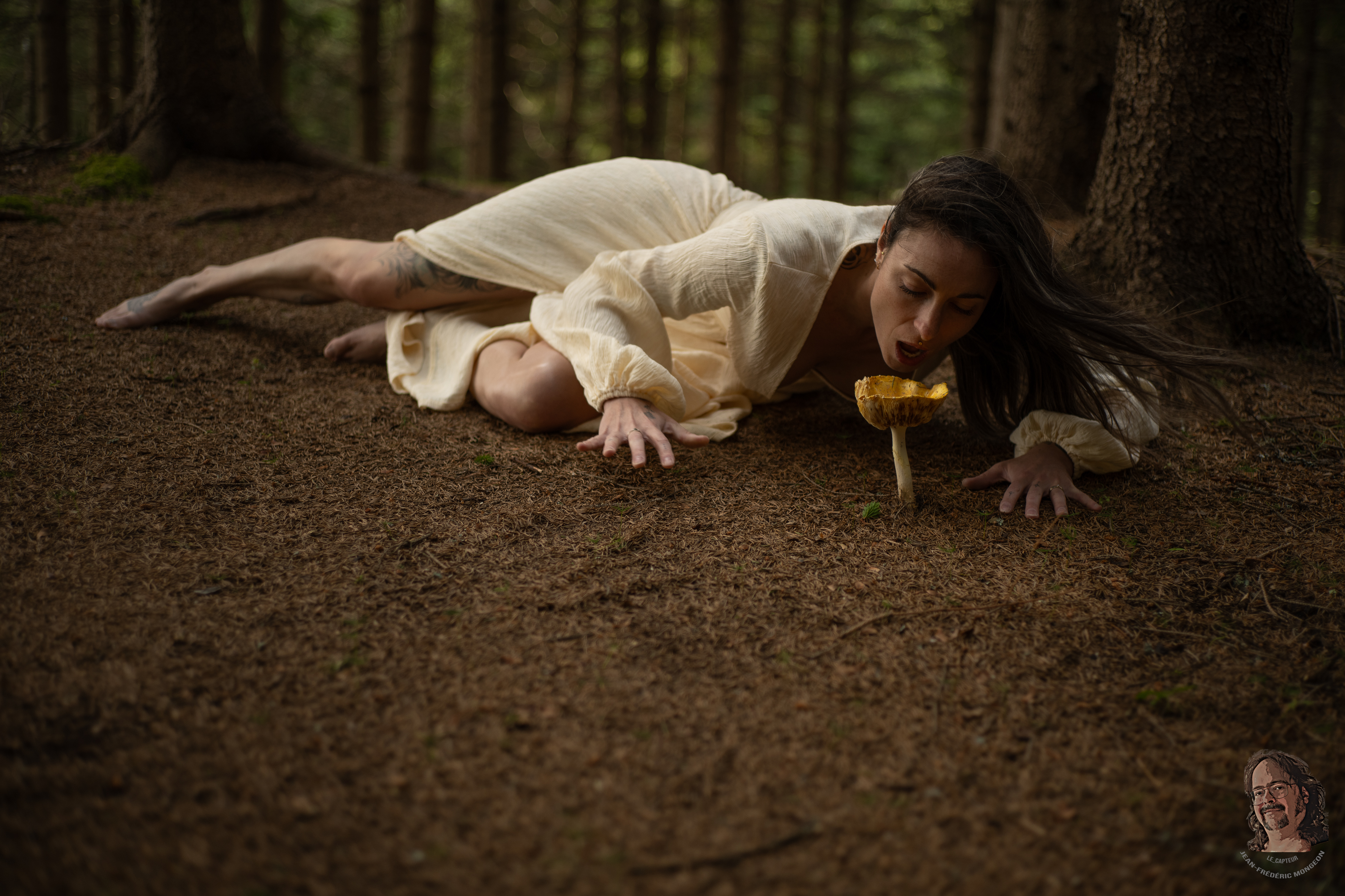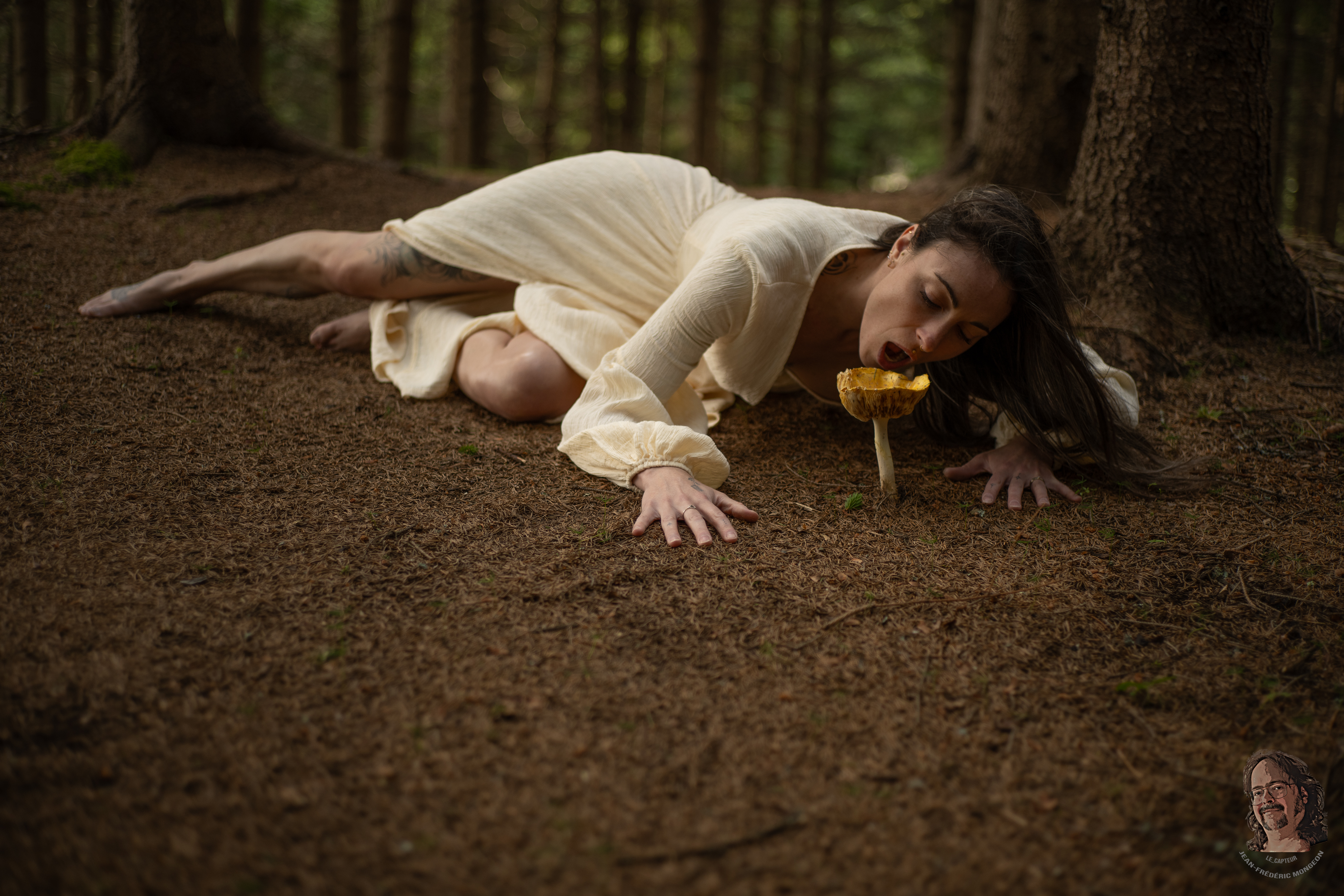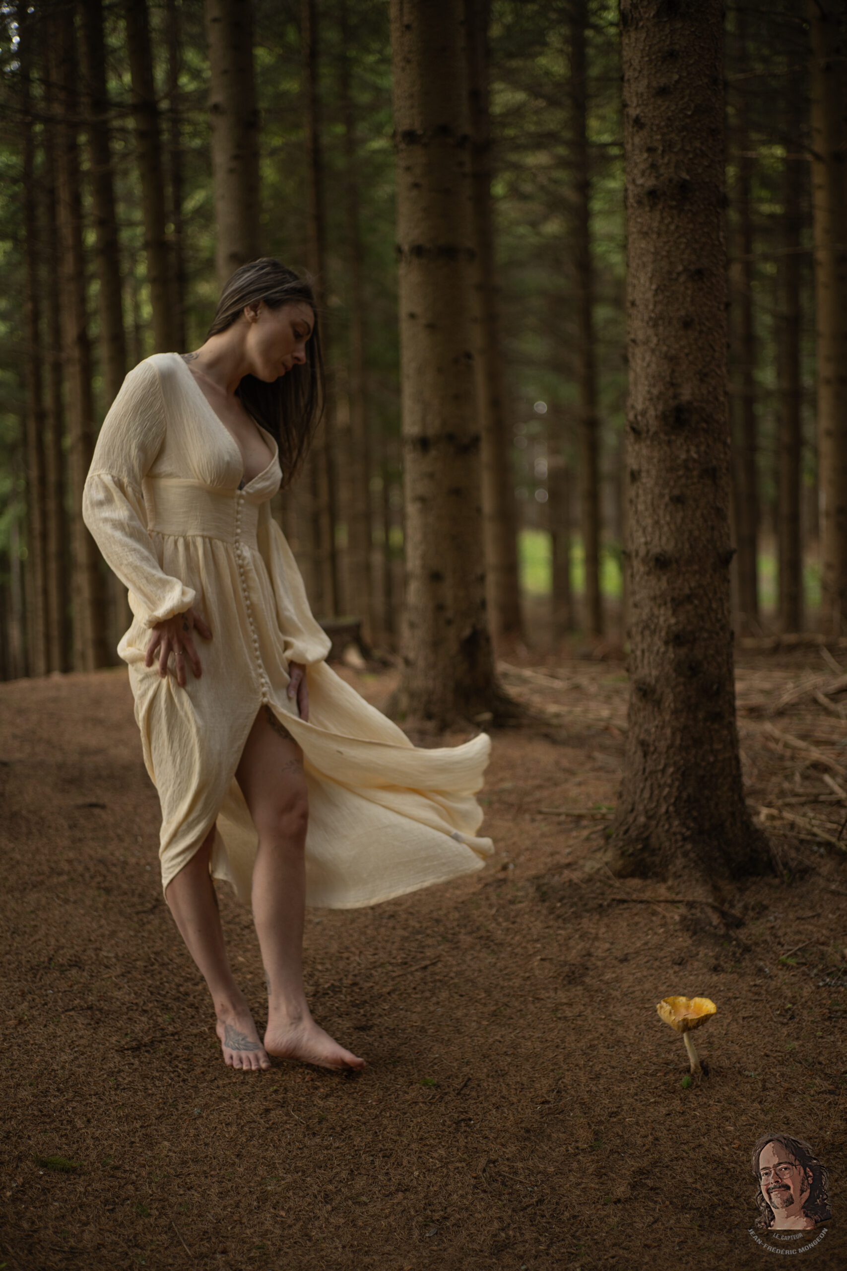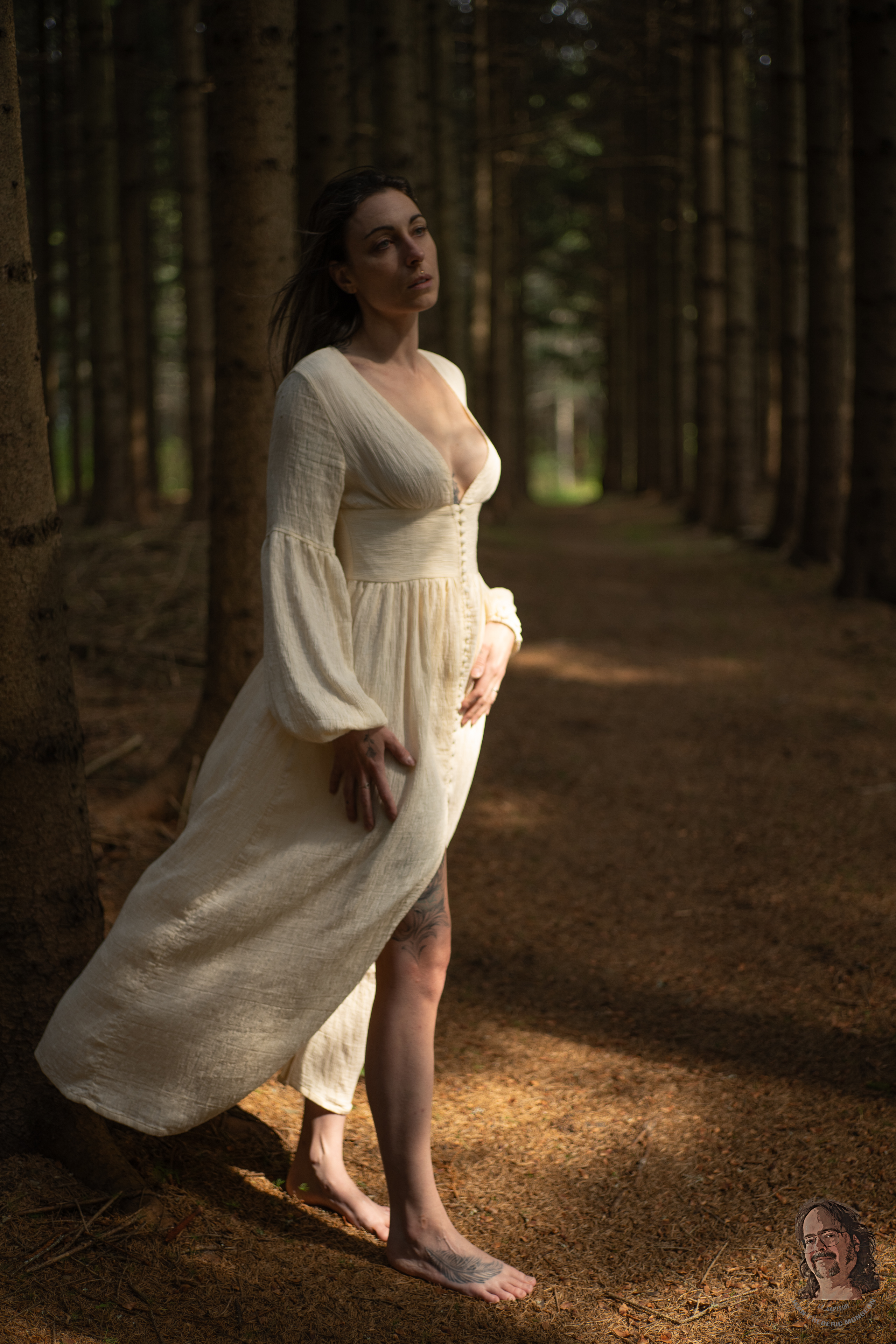 Dans la pénombre des conifères, une silhouette blanche traverse le sous-bois comme une apparition fragile, entre silence, rituel et abandon.